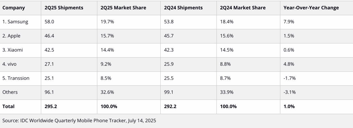 Samsung, yılın ikinci çeyreğinde 58 milyon telefon satarak yüzde 19,7'lik pazar payı ile zirveye yerleşirken, Apple 46,4 milyonluk satışla yüzde 15,7'lik payda kaldı.