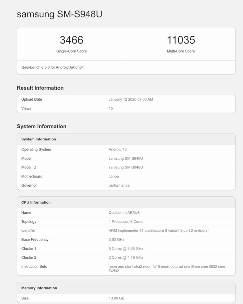 SM-S948U model numarasıyla listelenen cihaz, tek çekirdek testinden 3.466 puan, çoklu çekirdek testinden ise 11.035 puan aldı.