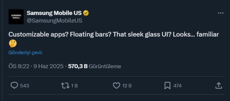 Samsung ABD'nin ilk paylaşımı, Apple'ın yeni "Liquid Glass" tasarım dilini ve kişiselleştirme özelliklerini hedef aldı.