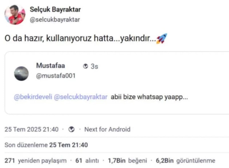 Bir kullanıcının “Abi bize WhatsApp yap” mesajını yanıtlayan Bayraktar, “O da hazır, kullanıyoruz hatta... Yakındır...” ifadeleriyle yerli mesajlaşma uygulamasının sinyalini verdi.