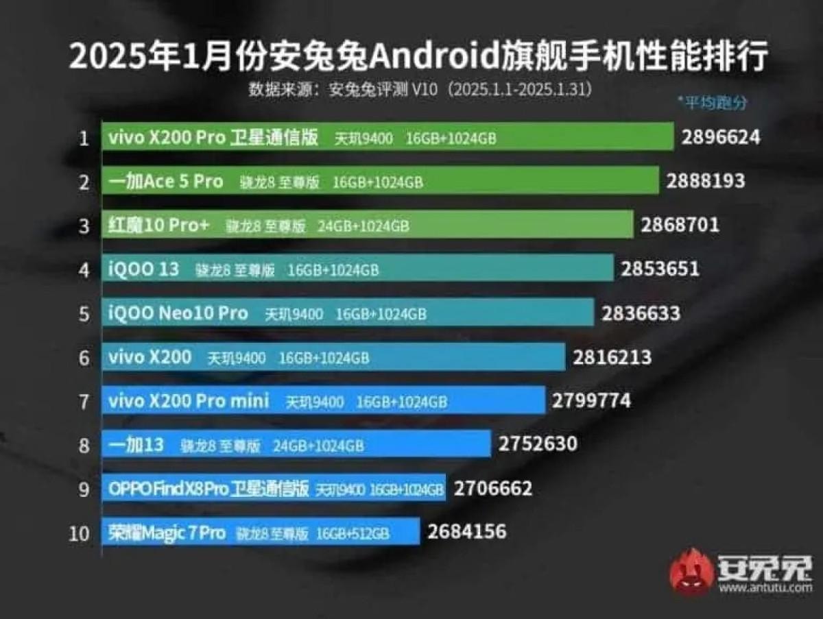 Vivo X200 Pro Satellite Edition, Dimensity 9400 ile 2.896.624 puan alarak listenin başında yer aldı.