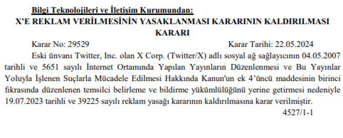 Eski ünvanı Twitter, Inc. olan X Corp. (Twitter/X) adlı sosyal ağ sağlayıcının 04.05.2007 tarihli ve 5651 sayılı İnternet Ortamında Yapılan Yayınların Düzenlenmesi ve Bu Yayınlar Yoluyla İşlenen Suçlarla Mücadele Edilmesi Hakkında Kanun'un ek 4’üncü maddesinin birinci fıkrasında düzenlenen temsilci belirleme ve bildirme yükümlülüğünü yerine getirmesi nedeniyle 19.07.2023 tarihli ve 39225 sayılı reklam yasağı kararının kaldırılmasına karar verilmiştir.