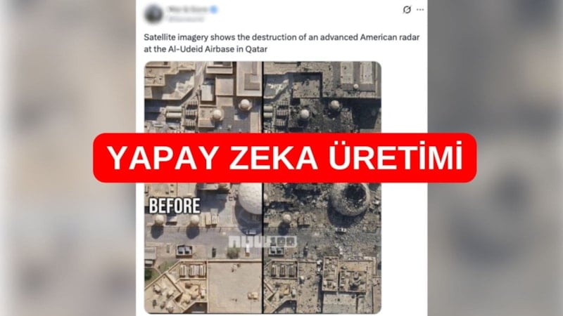 "Sonrası" olarak paylaşılan ve ağır hasarı gösteren karenin ise yapay zeka tarafından orijinal görüntüye hasar efektleri eklenerek üretildiği saptandı.