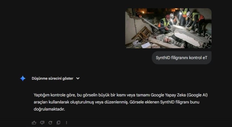 Google tarafından geliştirilen SynthID yapay zeka algılama aracı, bu görsellerin üzerinde yapay zeka üretimini doğrulayan dijital filigranlar tespit etti.