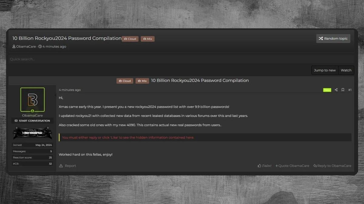 4 Temmuz 2024 tarihinde, "ObamaCare" adlı bir kullanıcı tarafından "RockYou2024.txt" adında devasa bir dosya, hacker forumunda yayınlandı.
