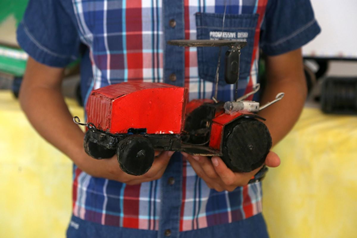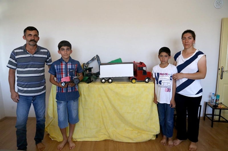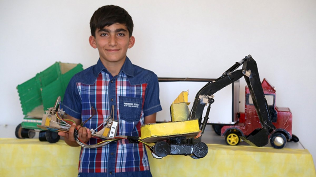 Traktörümüzün ölçülerini esas alarak orantısal olarak küçük ölçüler çıkardım ve ona göre kumandalı hareket eden traktör yaptım. Malzeme olarak da geri dönüşüm malzemelerini kullandım. Bunu başarınca çok hoşuma gitti ve yeni çalışmalara başladım. Daha sonra ekskavatör ve tank da yaptım. Hayalim makine veya elektrik mühendisi olmak. Böyle şeyler yapmayı seviyorum.