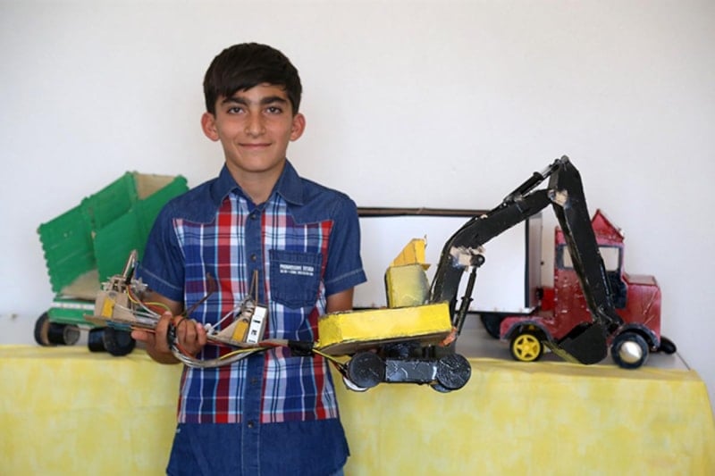 Malatya'nın Yazıhan ilçesinde evde bulduğu atıl malzemelerle traktör, kamyon, kepçe gibi araçlar yapan 13 yaşındaki Mustafa Kemal Parlak, kendini geliştirip TEKNOFEST'e katılmak istiyor.