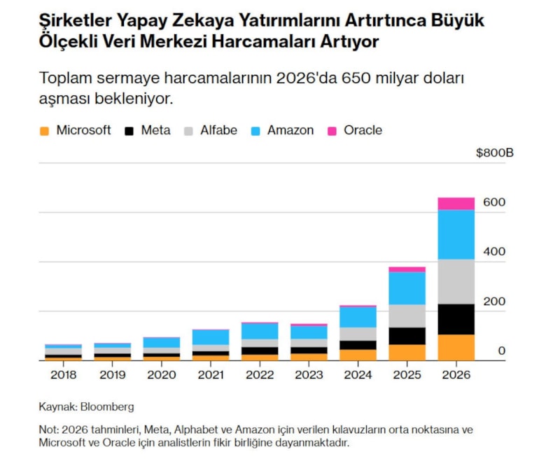Yapay zeka algoritmalarını eğitebilen devasa veri merkezlerine yapılan harcamaların 2026 yılında 650 milyar dolara ulaşması bekleniyor.