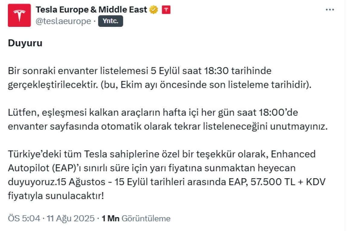 Tesla’dan yapılan açıklamaya göre sıradaki envanter listelemesi 5 Eylül saat 18.30 tarihinde olacak.