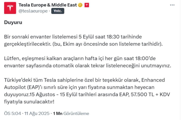 Tesla Türkiye, hem mevcut kullanıcılarını hem de yeni araç almak isteyenleri yakından ilgilendiren gelişmeyi duyurdu. Şirket, bir sonraki toplu araç listeleme tarihini açıkladı.