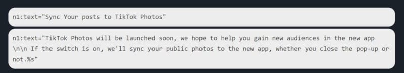 Kodlarda, TikTok Photos’un fotoğraf paylaşıp benzer zevklere sahip insanlara ulaşabileceği bir platform olabileceği vurgulanıyor.