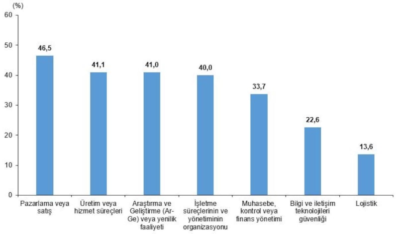 Muhasebe, kontrol veya finans yönetimi amacıyla yapay zeka kullanımı %33,7, bilgi ve iletişim teknolojileri güvenliği amacıyla yapay zeka kullanımı %22,6, lojistik faaliyetler amacıyla yapay zeka kullanımı ise %13,6 oldu.