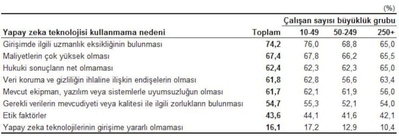 Yapay zeka teknolojilerinden herhangi birini kullanmadığını ancak kullanmayı düşündüğünü belirten girişimlerin yapay zekayı kullanmama nedenleri incelendiğinde; en önemli nedenin %74,2 ile girişimde ilgili uzmanlık eksiğinin bulunması olduğu görüldü.
