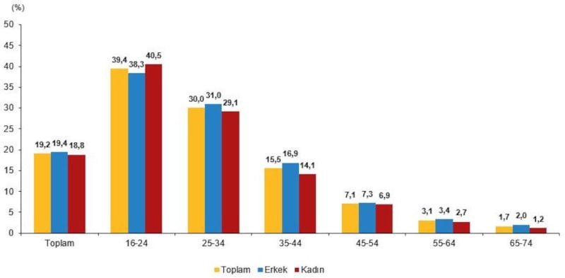 Yapay zeka kullanma oranı yaş grubuna göre analiz edildiğinde ise, en fazla %39,4 ile 16-24 yaş grubunda yer alan bireylerin yapay zeka kullandığı, bunu %30,0 ile 25-34 yaş grubunun, %15,5 ile 35-44 yaş grubunun takip ettiği saptandı.