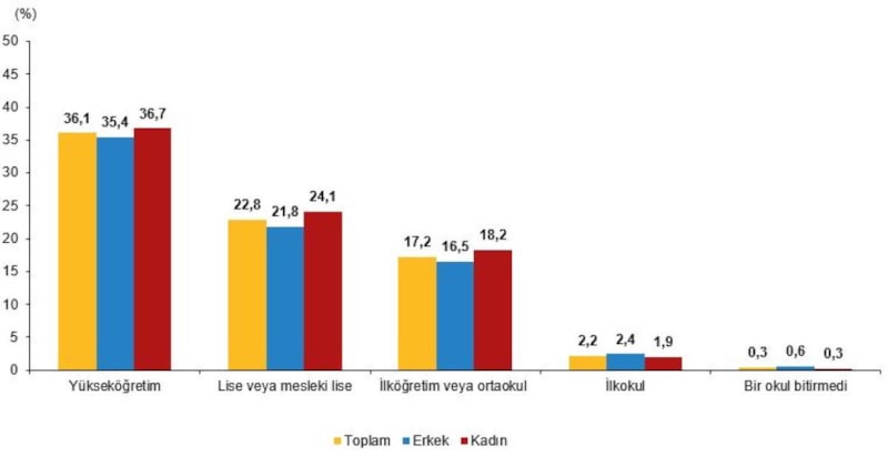 Bunu, %22,8 ile lise veya mesleki lise mezunu, %17,2 ile ilköğretim veya ortaokul mezunu, %2,2 ilkokul mezunu bireyler takip etti.