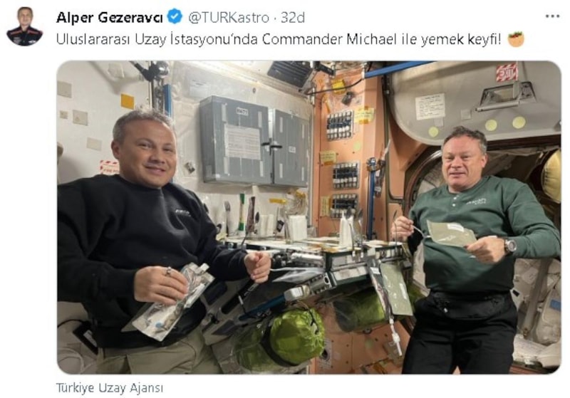 Lopez-Alegria da kendi X hesabından aynı fotoğrafı "İlk Türk astronotla Uluslararası Uzay İstasyonu'nda yemek yiyoruz." notuyla paylaştı.