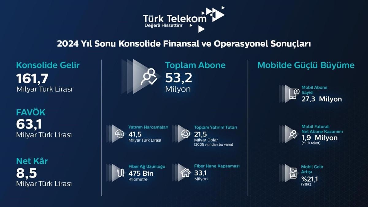 2024 yılında yıllık bazda %11,8 reel büyümeyle 161,7 milyar TL konsolide gelire, yıllık bazda %30,5 reel artışla 63,1 milyar TL konsolide FAVÖK’e ulaşan ve yıl boyunca 41,5 milyar TL yatırım yapan Türk Telekom, 2025 yılı için operasyonel gelirlerinde %8 - %9 aralığında büyüme öngörürken, konsolide FAVÖK marjının % 38 - % 40 seviyesinde, yatırım harcamalarının satış gelirlerine oranının ise %28 - %29 aralığında gerçekleşmesini bekliyor.