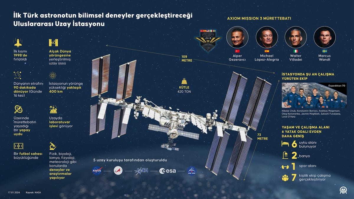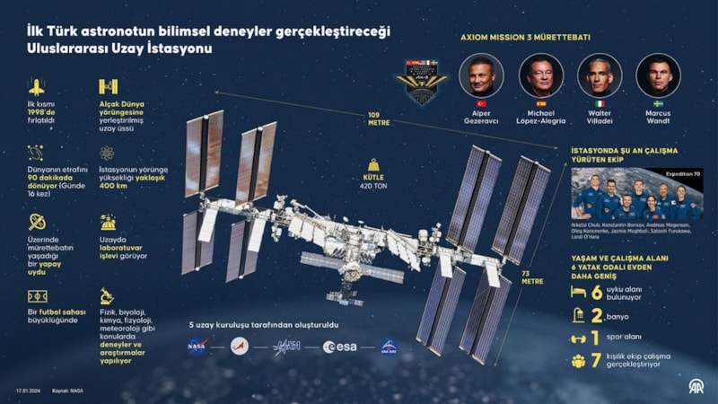 Astronotların uzaydaki evi şeklinde tanımlanan istasyon, Türkiye'nin ilk astronotu Alper Gezeravcı'nın 14 gün boyunca birbirinden farklı 13 bilimsel deneyine ev sahipliği yapacak.