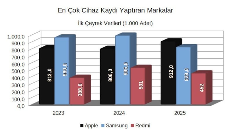 BTK verileri, Türkiye akıllı telefon pazarının yüzde 73,5'inin Apple, Samsung ve Redmi olmak üzere üç marka tarafından domine edildiğini de gösteriyor.