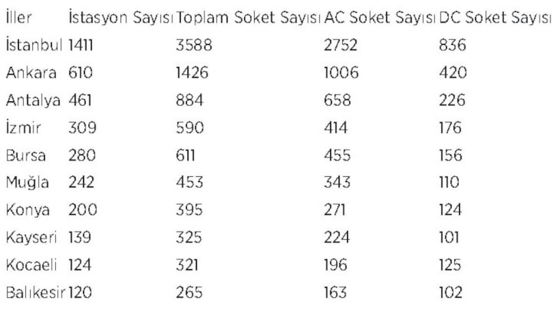 Türkiye genelinde en fazla elektrikli araç istasyonu ve soket sayısına sahip şehirler şöyle;
