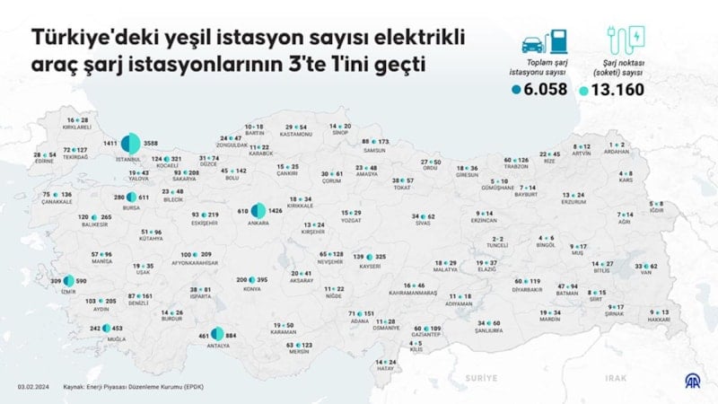 EPDK verilerine göre, 2023 başında Türkiye çapında 1719 olan şarj istasyonu sayısı ocak sonu itibarıyla 6 bin 58'e, 3 bin 81 olan şarj noktası (soketi) sayısı ise 13 bin 160 adete yükseldi.