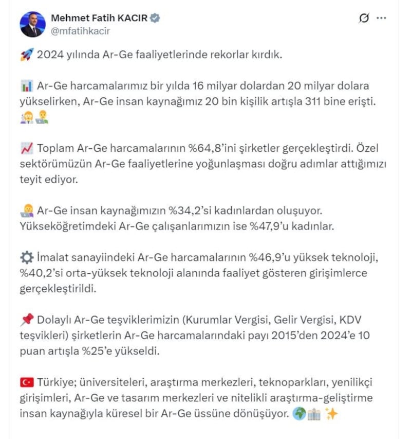 Kacır, N Sosyal medya hesabından yaptığı açıklamada,"Ar-Ge harcamalarımız bir yılda 16 milyar dolardan 20 milyar dolara yükselirken, Ar-Ge insan kaynağımız 20 bin kişilik artışla 311 bine erişti. Toplam Ar-Ge harcamalarının yüzde 64,8’ini şirketler gerçekleştirdi. Özel sektörümüzün bu faaliyetlere yoğunlaşması doğru adımlar attığımızı teyit ediyor. Ar-Ge insan kaynağımızın yüzde 34,2'si kadınlardan oluşuyor.Yükseköğretimdeki Ar-Ge çalışanlarımızın ise yüzde 47,9'u kadınlar" olduğunu belirterek 2024 yılında Ar-Ge faaliyetlerinde önemli rekorlar kırıldığının altını çizdi.