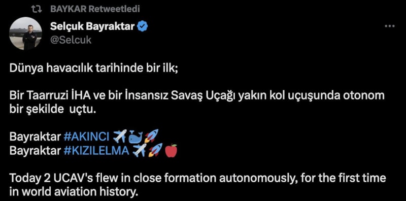 Tamamen yerli imkanlarla, milli ve özgün olarak geliştirilen Türkiye'nin ilk insansız savaş uçağı Bayraktar Kızılelma ve Bayraktar Akıncı TİHA ile kol uçuşu icra etti.