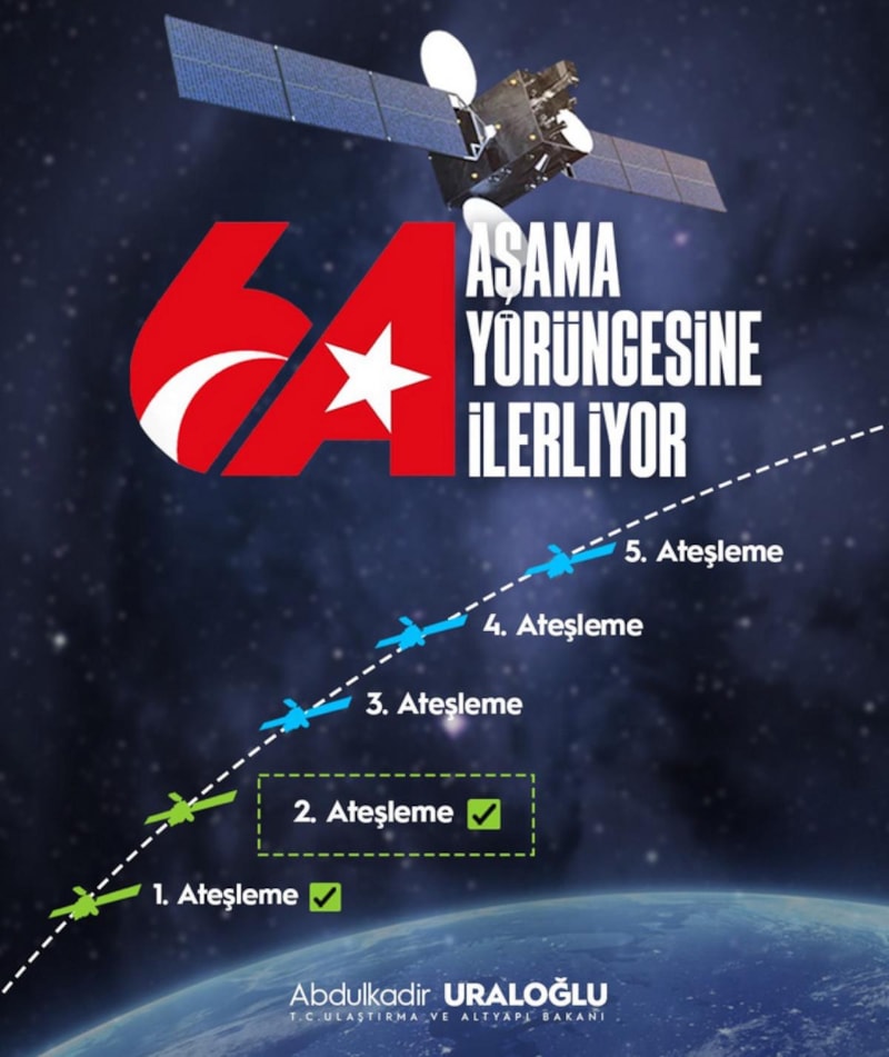 Ulaştırma ve Altyapı Bakanı Abdulkadir Uraloğlu, "İlk yerli ve millî uydumuz TÜRKSAT 6A'nın 69 dakika süren 2. ateşleme süreci başarıyla sonuçlandı." dedi.