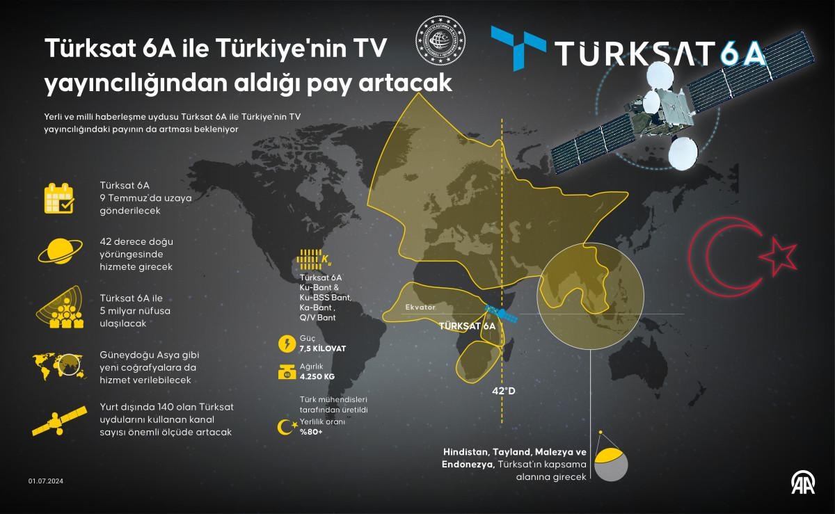 Türksat 6A'nın 42 derece doğu yörüngesinde hizmete girmesiyle daha önce Türksat uydularıyla kapsanmayan Güneydoğu Asya gibi yeni coğrafyalara da hizmet verilebilecek.