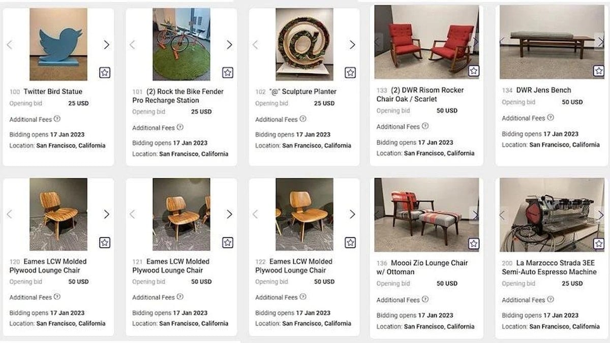 Twitter'ın San Francisco genel merkezindeki yüzlerce "kurumsal ofis varlığı”, özel bir şirket tarafından açık artırmaya çıkarıldı.