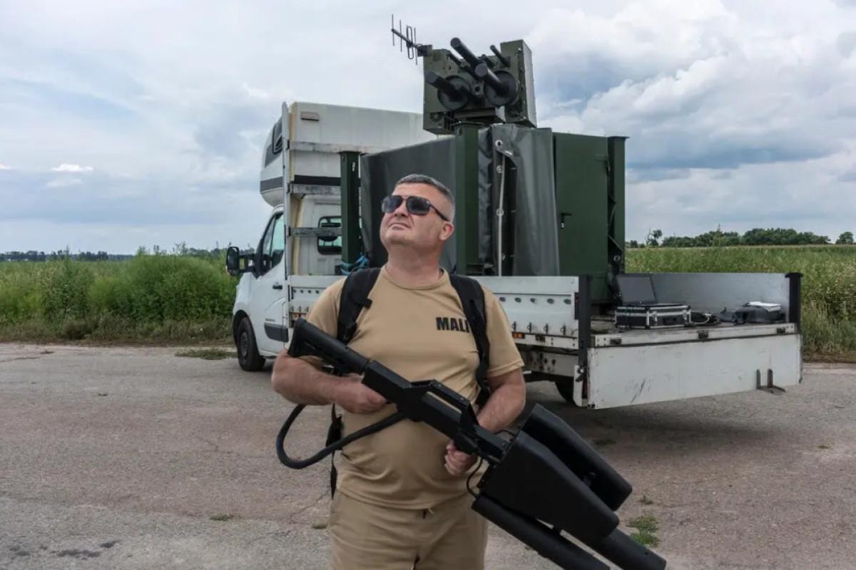 Ağustos ayında Ukrayna'nın orta kesimindeki bir alanda, Sovyetler Birliği'nin eski özel kuvvetler komutanı ve elektronik savaş firması Piranha'nın kurucusu olan 53 yaşındaki Yurii Momot, çatışma için yapılmış yeni bir anti-drone silahını sergiledi. (Yukarıdaki görsel.)