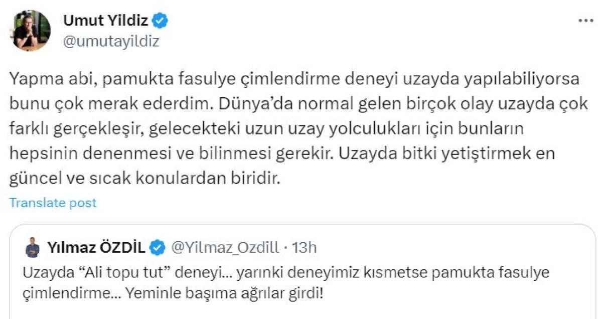 Paylaşımına "Yapma abi" diyerek başlayan Yıldız, "Pamukta fasulye çimlendirme deneyi uzayda yapılabiliyorsa bunu çok merak ederdim." ifadesini kullandı.