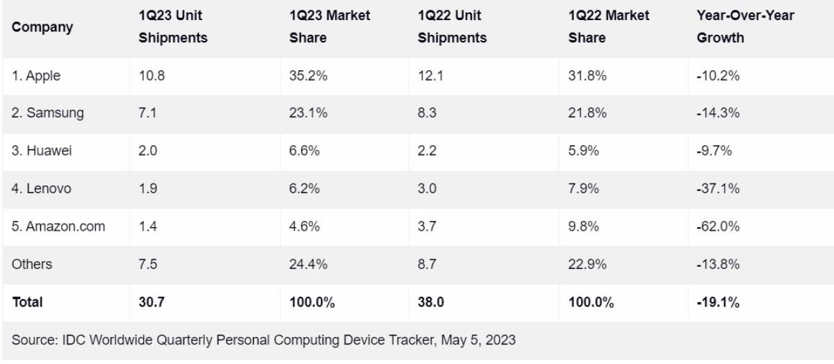 Samsung ise 2023'ün ilk çeyreğinde 7.1 milyon tablet satışı gerçekleştirdi. Satışlar, geçen yıla kıyasla yüzde 14,3 oranında düşüş gösterdi.