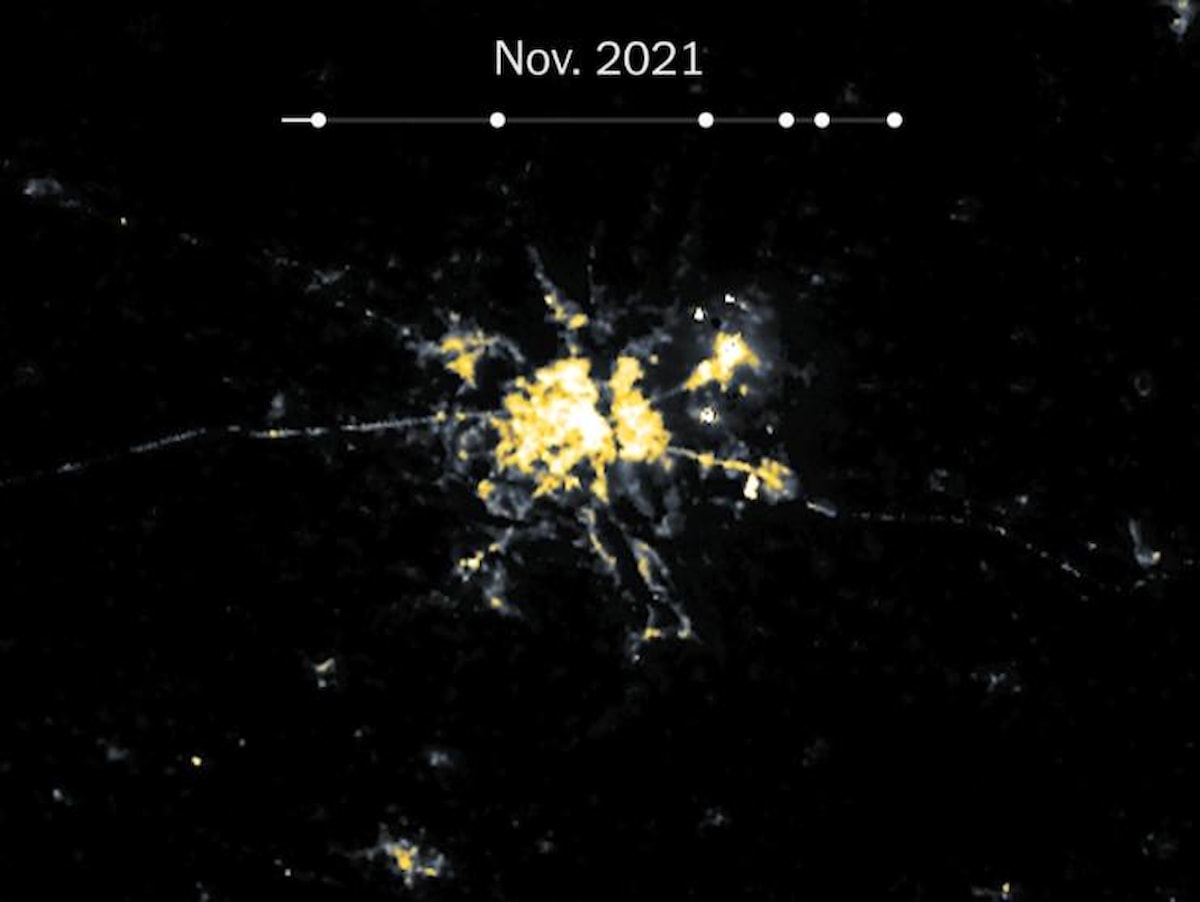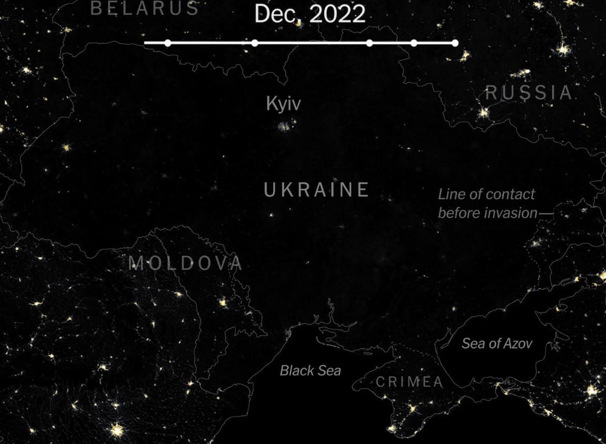 Savaştan önce uydu tarafından bir ışık ağı olarak yakalanan Kiev gibi şehirler, sonraki aylarda solup gidiyor ve parçalanıyor.
