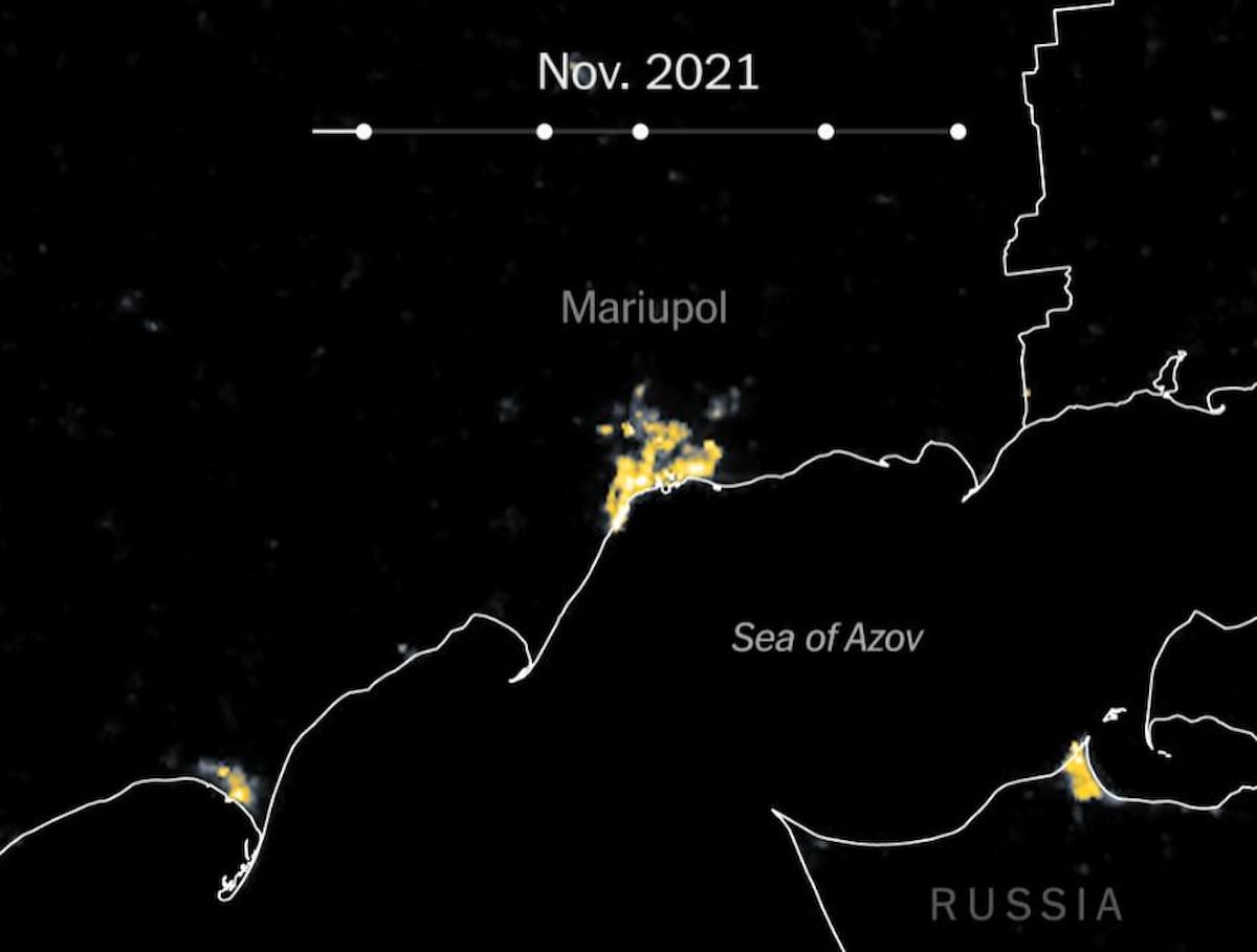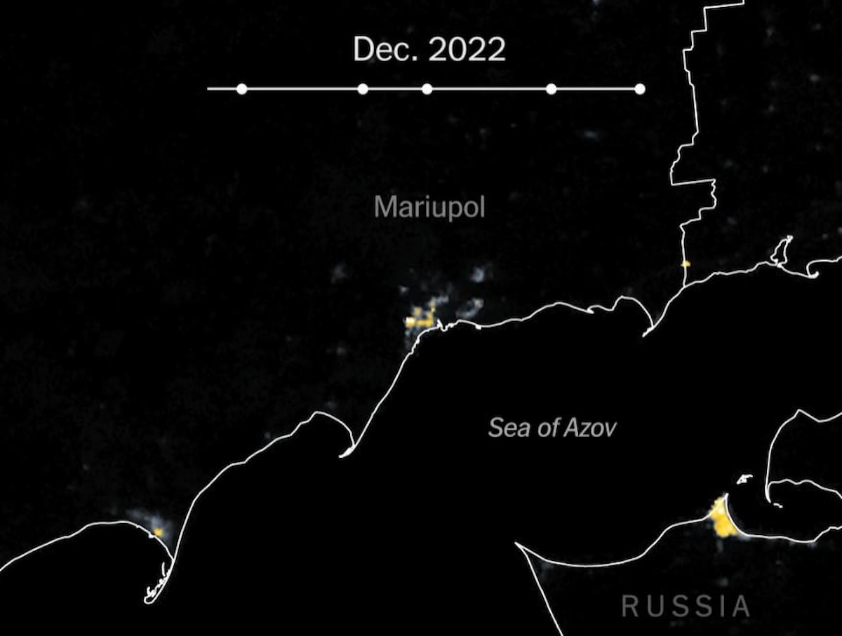 Gelişen bir çelik endüstrisinin yanı sıra kilometrelerce kumsallara sahip bir liman olan Mariupol, Kasım 2021'den Aralık 2022'ye kadar parlak bir şekilde aydınlatılmış halden ürkütücü bir karanlığa dönüşüyor.