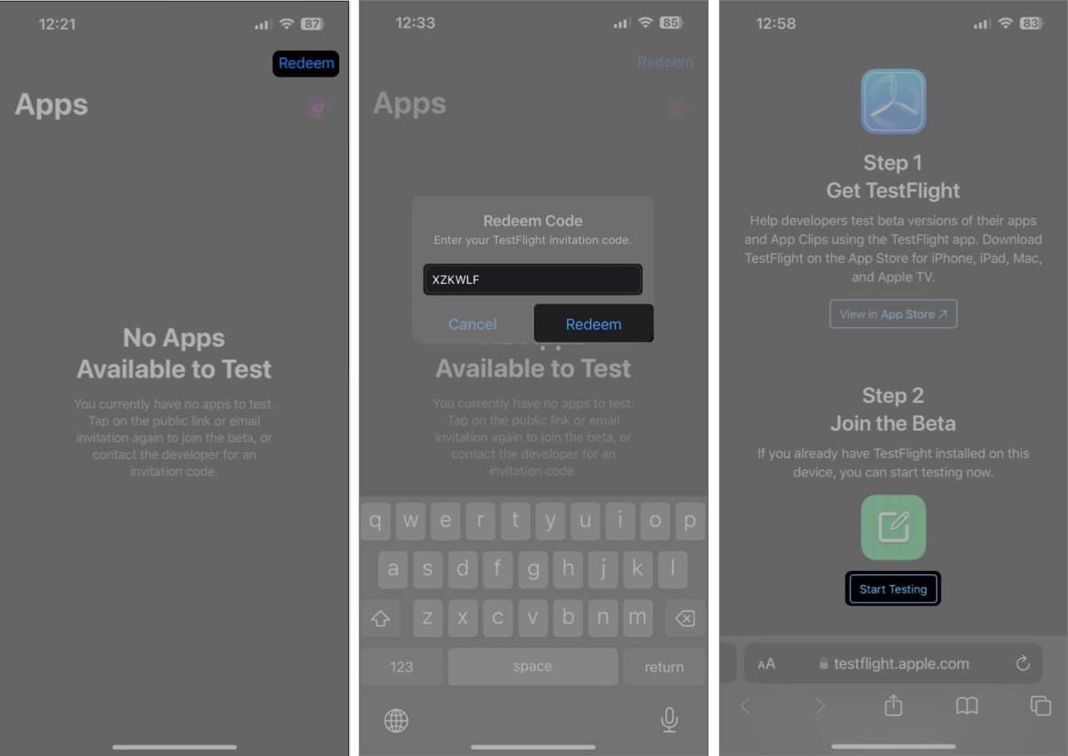 Bir TestFlight davet kodunuz varsa, sağ üstteki Kullan → TestFlight davet kodunuzu girin → Kullanmayı Onayla seçeneğine dokunun .