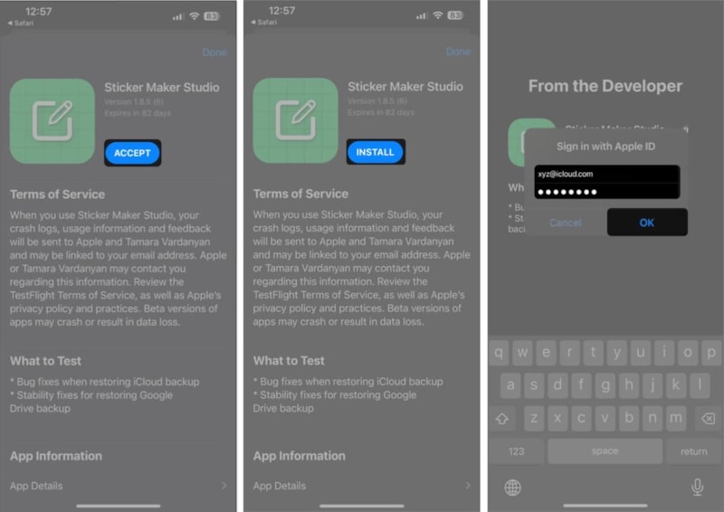 Uygulamanın sayfası TestFlight'ta açıldığında Kabul Et → Yükle'ye dokunun .