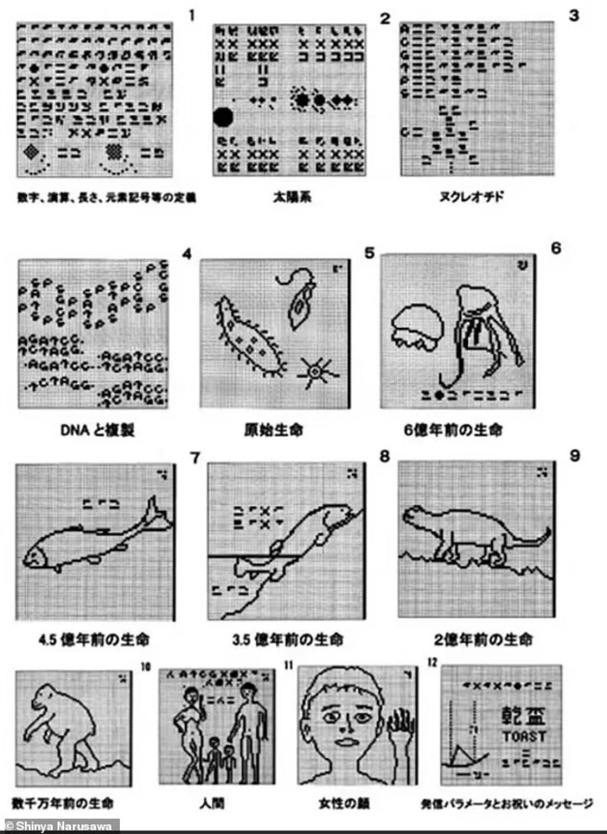 Sinyallere dönüştürülen ve bir e-postadaki bilgiye benzer şekilde gönderilen bu 13 çizim, tek hücreli organizmalardan balığa, kertenkeleye, maymuna ve insan ailesine kadar Dünya üzerindeki yaşamın evrimini tasvir ediyor.