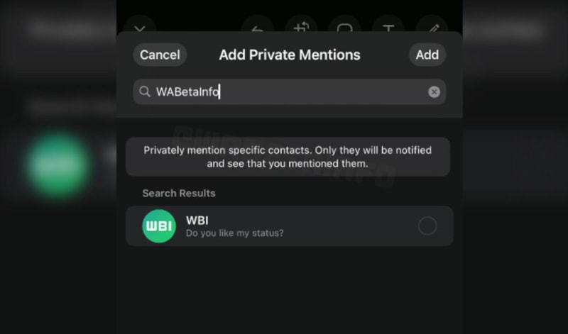Aşağıdaki ekran görüntüsünde görebileceğiniz gibi, WhatsApp şu anda durum güncellemelerinde kişilerden "özel olarak" bahsetme özelliği üzerinde çalışıyor. Diğer kullanıcılar, bu etiketi göremeyecek.