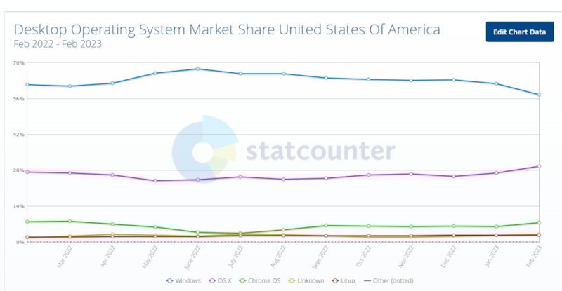 Statcounter verilerine göre, Windows işletim sistemi, son yıllarda macOS ve Chrome OS'un büyümesi ile birlikte popülerliğini yitirdi.