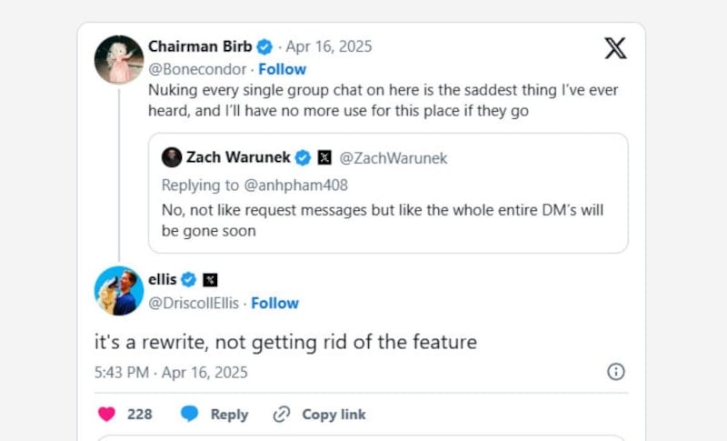 Kullanıcı Zach Warunek'in bir mühendise yönelttiği soruya aldığı "Sayfa yakında silinecek." şeklindeki yanıt, bazı kullanıcılar tarafından DM özelliğinin kaldırılacağı şeklinde yorumlandı.