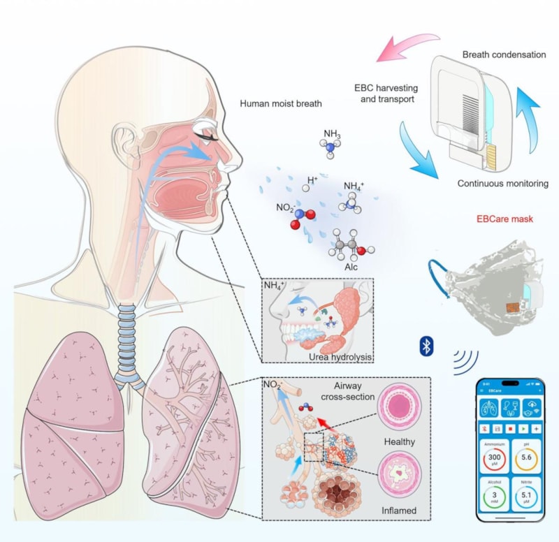 California Teknoloji Enstitüsü'ndeki Prof. Wei Gao ve meslektaşları tarafından geliştirilen EBCare isimli maske, KOAH (kronik obstrüktif akciğer hastalığı), astım ve koronavirüs sonrası enfeksiyonlar gibi solunum yolu rahatsızlıklarını izlemek için tasarlandı.