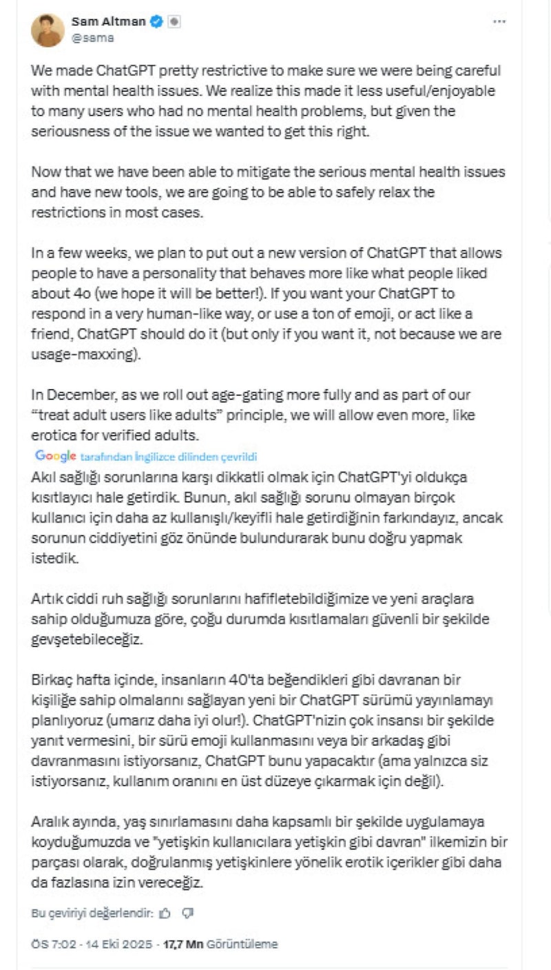 Altman, “Yetişkin kullanıcıları yetişkin gibi davranarak ele alacağız” diyerek platformun erotik içeriklere izin vereceği yeni bir dönemi işaret etti.