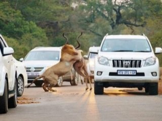 Güney Afrika’da bulunan Kruger Ulusal Parkı’nda iki dişi aslan araçların arasında bir antilopu parçalayarak yedi. An be an fotoğraflanan aslan avı, 2 milyon hektarlık dev parkın H1 yolunda gerçekleşti.