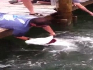 Çıplak elle dev balık avlama yöntemi anbean kameralara yansıdı. Bir iskeleye yatan adam eline aldığı küçük balıkla dev bir balık yakaladı.