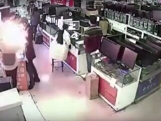 Çin'de, bir müşterinin ısırdığı telefon bataryasının patladığı anlar güvenlik kamerasına yansıdı.