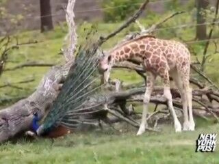 Görüntülerde, gezinen tavus kuşunun renkli tüylerini gören yavru zürafa, ona yaklaşarak koklamak istiyor. Tam bu anda bitki sandığı tüylerin hareket ettiğini fark edince zürafa büyük bir şaşkınlığa uğrayarak, deyim yerindeyse eli ayağı birbirine dolaşarak oradan uzaklaşıyor.