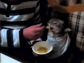 Kedisini koltuğa bebek gibi oturtan adam, boynuna yakalık takarak kaşıkla çorba içirdi. Hasta kediye çorba içirmek -VİDEO