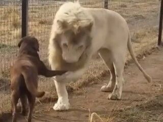 Görüntülerdeki aslan, karşısındaki köpeğin patisini öpüyor. Kaydedilen ve sosyal medyada paylaşılan o anlar herkesin ilgisini çekti.