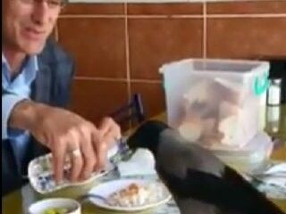 Lokantada masasına konan kargayla yemeğini paylaştı
